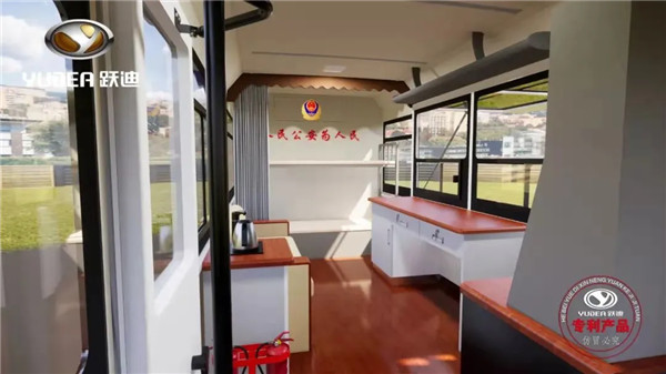 躍迪移動警務(wù)室是根據(jù)民警基層單位實際工作需求研制而成,具有超大的工作空間。該車除裝備有計算機、監(jiān)控器、飲水機、LED顯示屏等基礎(chǔ)設(shè)施外,還可以根據(jù)用戶需求配備單警裝備和警用器材等設(shè)備。